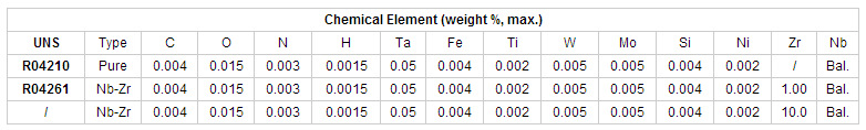 材料: Nb-1%Zr, Nb-10%Zr, Nb-47%Ti, Ta-2.5%W, Ta-10%W